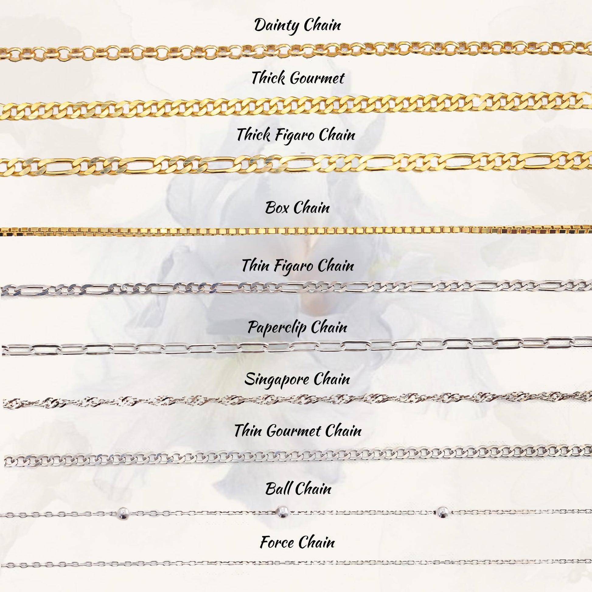 WHAT/WHY: Every great jewelry collection starts with the perfect chain. Dive into our curated selection of high-quality designs, offering a foundational piece for every style. Whether you need a sturdy chain for a treasured pendant, a delicate accent for layering, or a standalone statement, our collection provides the ideal solution. Explore popular styles including Dainty Chain, Thick Gourmet, Thick Figaro, Box Chain, Thin Figaro, Paperclip Chain, Singapore Chain, Thin Gourmet, Ball Chain, and Force Chain – each carefully crafted to complement your unique look.